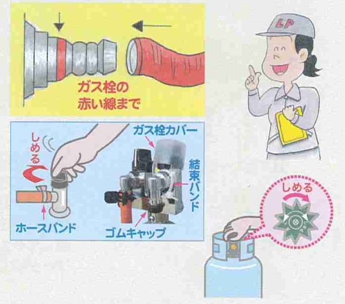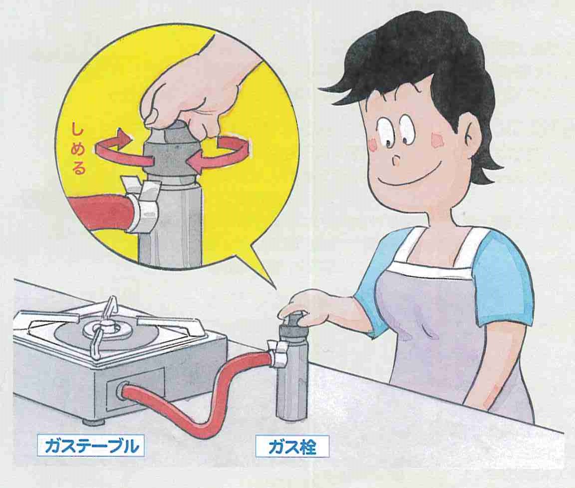 ご存知ですか ガス栓は、使用時には全開で、使用後は完全に閉めてください。 ガスをお使いになるときは、ガス栓をぜ全開で、お使いにならない場合は、完全に閉めてください。 また外出するときや、おやすみ前には、ガス栓、器具栓が閉まっていることを確認してください。 長期間ご不在になるときは、容器バルブを閉め、当社にご連絡ください。 使用していないガス栓には、必ずゴムキャップをつけ、間違って開けてしまわないようにガス栓カバーをつけてください。 ※ガス栓カバーについて詳しくは当社へお尋ねください。 ※配管やガス栓をアースの代わりに使用しないでください。